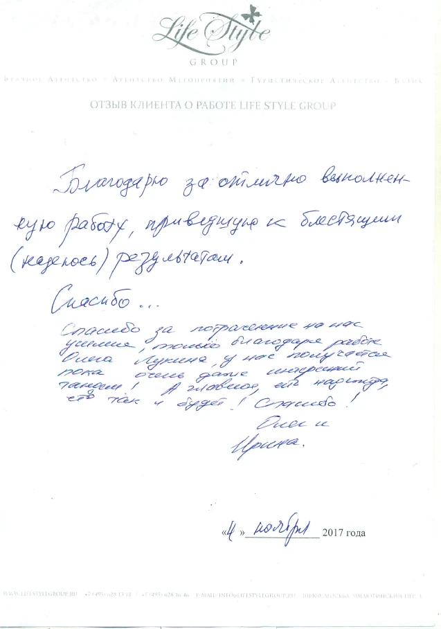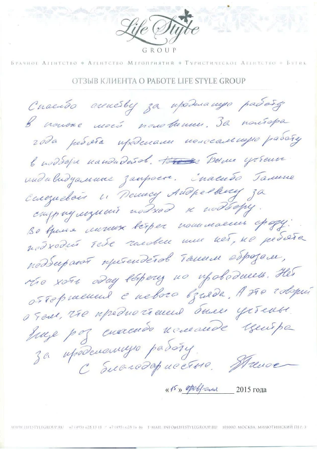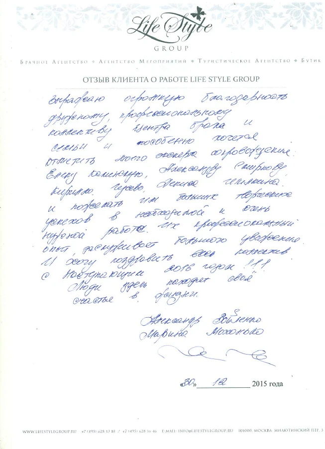 Life Style Group – современная компания свадебной индустрии, отличающаяся от существующих служб знакомств и брачных агентств, собственными эффективными методиками и технологиями, созданными на основе российского и международного опыта в области семейной психологии и коучинга, детальным анализом запросов каждого Клиента и современного рынка услуг, регулярным контролем качества и динамичностью, а также строгой приверженностью к высокими стандартам сервиса, которые позволяют нам быть впереди и превосходить ожидания Клиентов!
